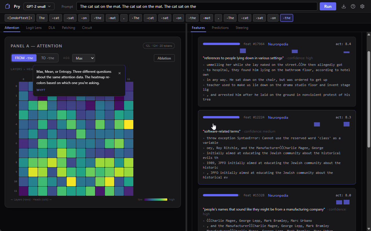It’s not a replacement for TransformerLens if you need programmatic access to every activation in the forward pass. Pry is a window, not a laboratory. Interpretability concepts are genuinely hard even with good explanations and a nice UI. A tooltip can tell you what an attention head is. It can’t give you the intuition for when a pattern in the attention map means something versus when it’s noise. That takes time and practice, same as anything else.