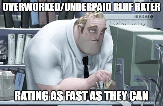 RLHF raters are paid for throughput. Hundreds of comparisons per shift. They’re going to prefer responses they can parse fast, clear structure, simple vocabulary, the “helpful assistant” vibe every chatbot converges on even though nobody asked for it. Reward models learn to match that preference. So they’re not measuring “how good is this response.” They’re measuring “how quickly can a tired person with 200 more of these in their queue decide this one is fine.” (which I’m sure has nothing to do with why every LLM sounds like the same eager intern)