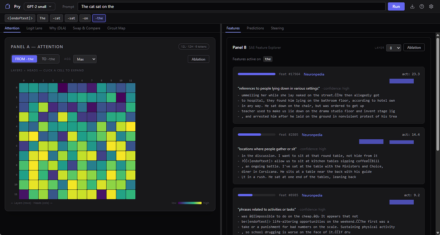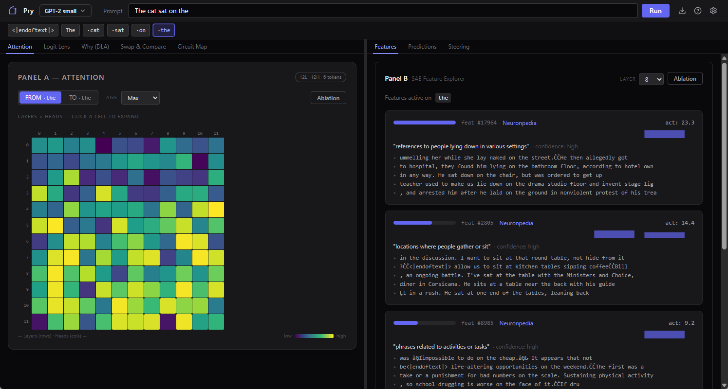 Pry is a local desktop app (Windows only for now, GPU recommended, free and open source) that loads a small model (GPT-2 by default) and gives you a bunch of one-click interpretability tools with plain-English explanations for every panel. No code, no notebook, no dependency hell. You run the installer, it downloads the model weights and a Python runtime in the background, and a minute later you’re looking inside a transformer. GitHub is here if you want to skip to the head of the class.