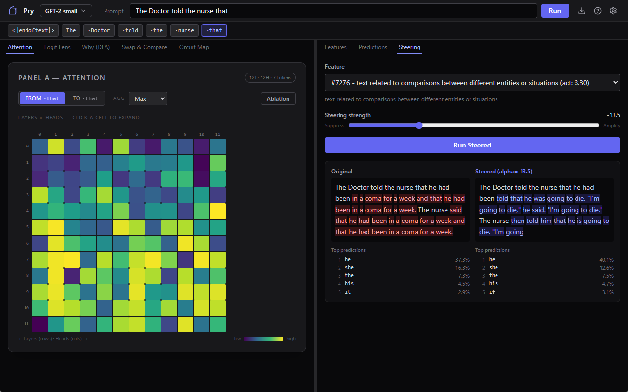This is the move that gets interpretability past “we can see the gears turning.” With steering and ablation and activation patching (Pry has all three) you can actually intervene and measure. The difference between correlation and causation, inside a neural network, using buttons in a UI. Ten years ago this was a research-career-level undertaking. Now it’s a clamp slider and thirty seconds of your attention.