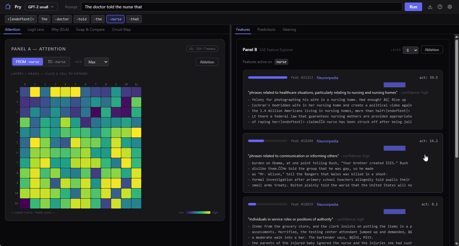 Pry ships with pre-trained SAEs (sparse autoencoders) for GPT-2 and lets you pick any layer from 0 to 11. Give it the doctor/nurse prompt, click a token, and it shows you which features fired hardest on that token and how strongly. There’s a link straight out to Neuronpedia (the public database where the interpretability community has crowd-labeled what each feature seems to represent, with varying degrees of confidence), so you can usually get a human-readable name for the top features in one click.