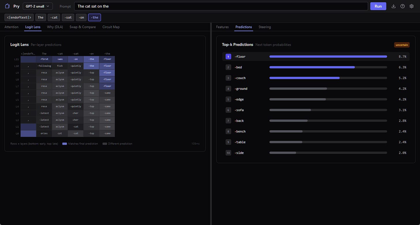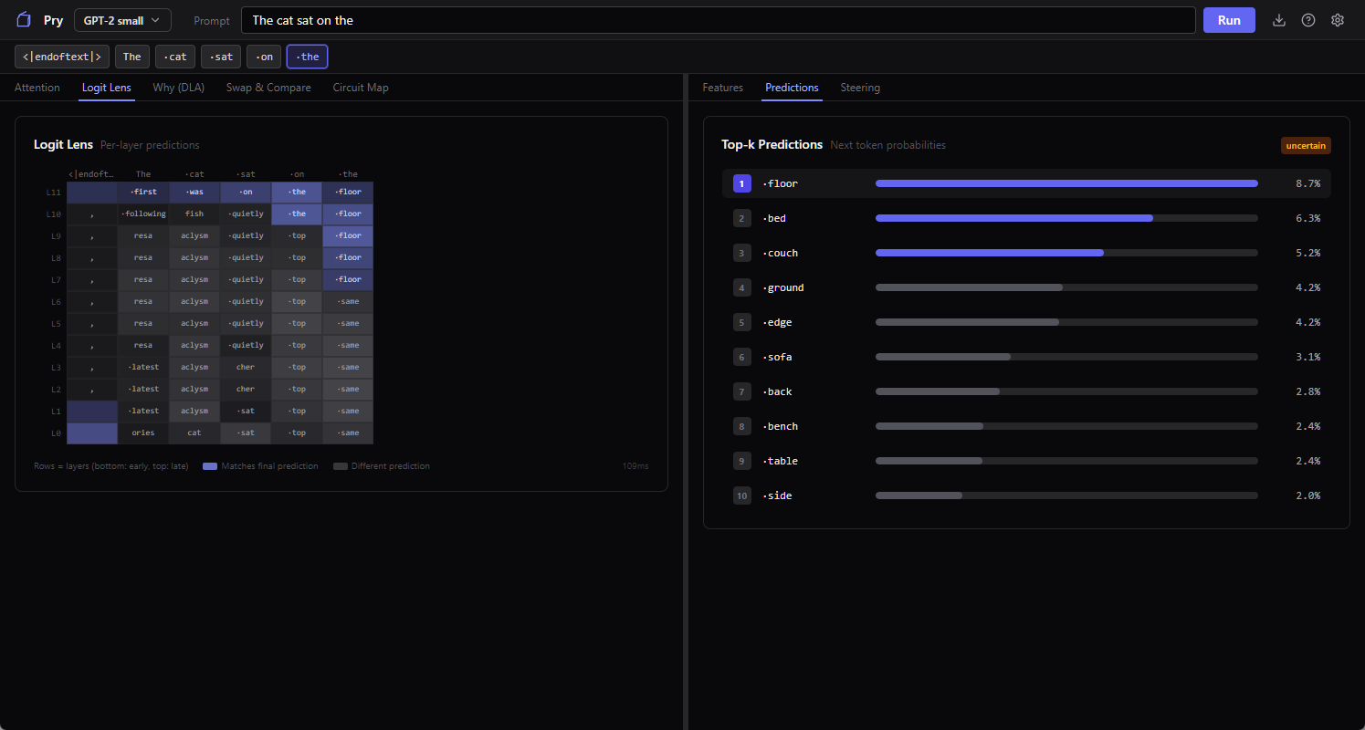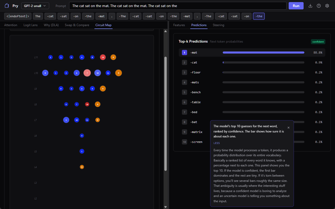 Pry’s tutorial opens with “The cat sat on the” and asks GPT-2 what comes next. This is the same prompt every interpretability demo has used since 2019, because it’s short, grammatical, and has a well-known textbook answer (”mat”). GPT-2 small doesn’t always land on mat in practice. It hedges between a handful of reasonable options (mat, floor, ground, bed, and a couple of others), and that hedging is actually what makes this a better demo than if the model just answered correctly every time. You get to watch it work.